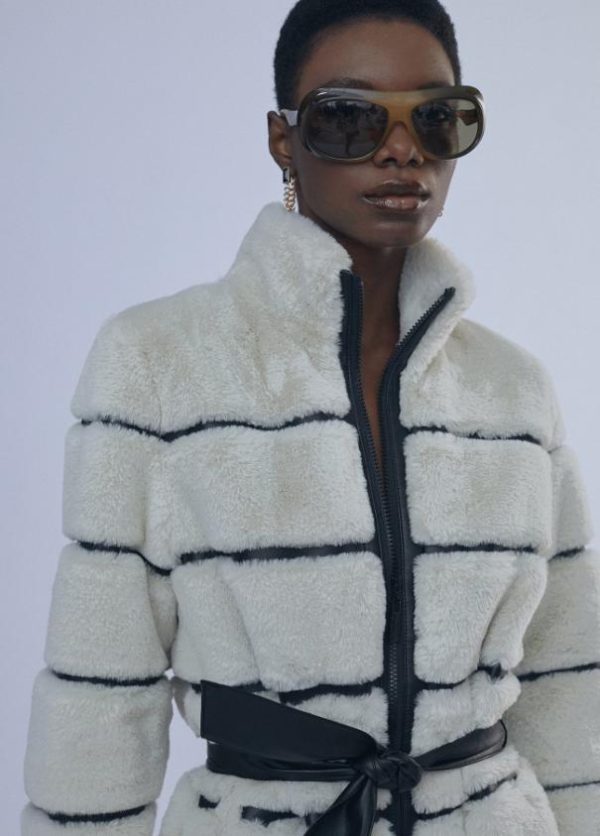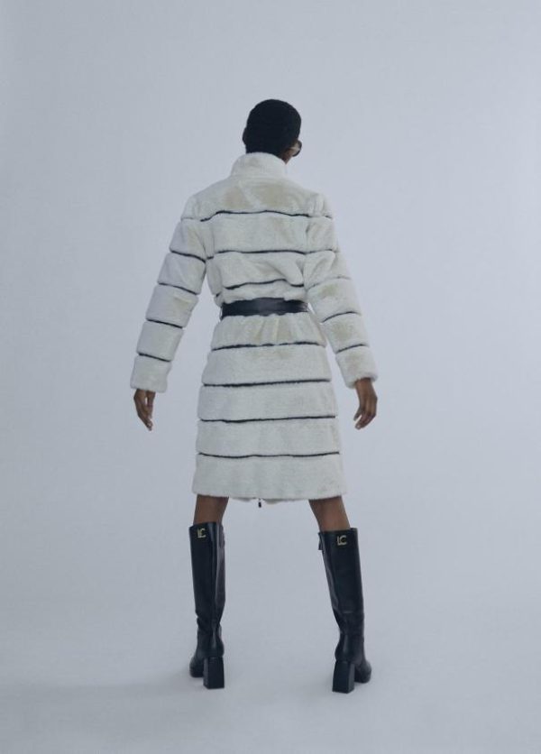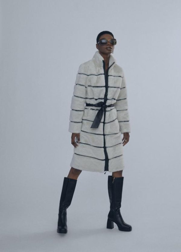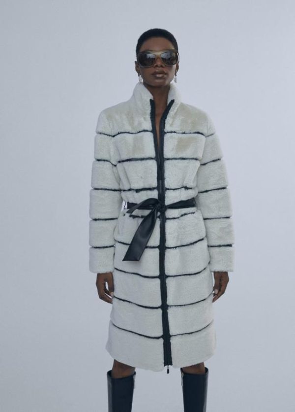 Abrigo de pelo monocolor combinado con efecto piel a contraste. Cierre con cremallera y cinturón a tono.