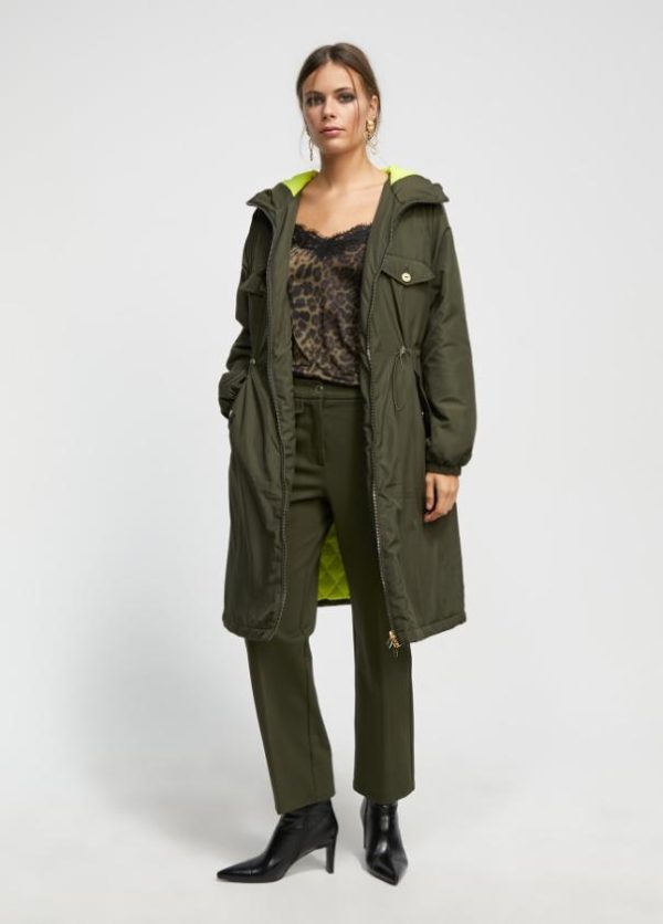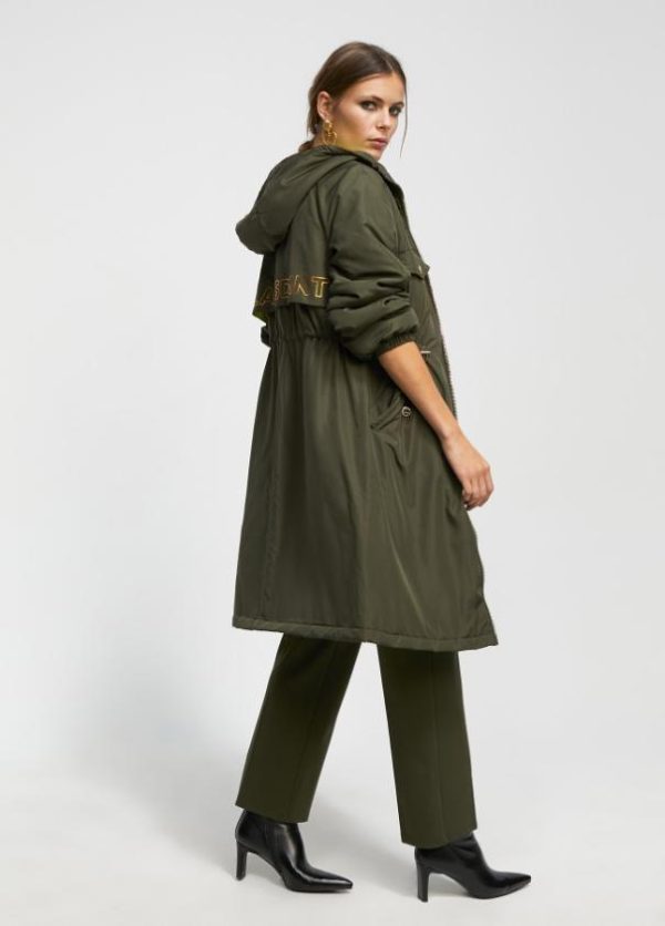 Anorak acolchado con capucha. Cierre con cremallera dorada de doble carro. Bolsillos frontales con tapete y botón. Cintura ajustable. Logo a contraste en espalda e interior acolchado en color lima.