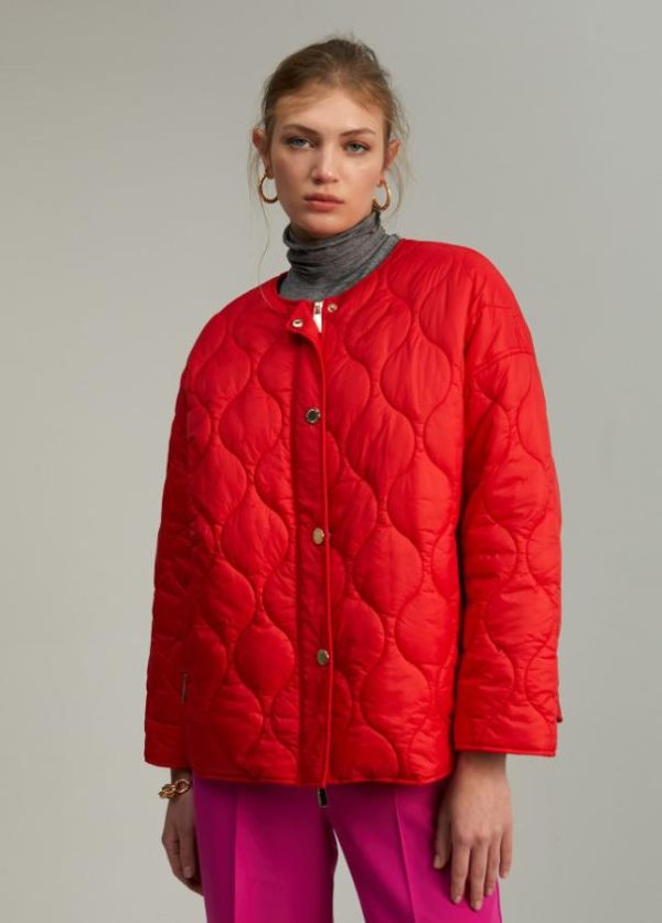 Chaqueta acolchada de cuello caja. Cierre con snaps metálicos y cremallera metálica con doble carro. Bolsillos laterales cerrados con cremallera. Aberturas en bajo lateral.