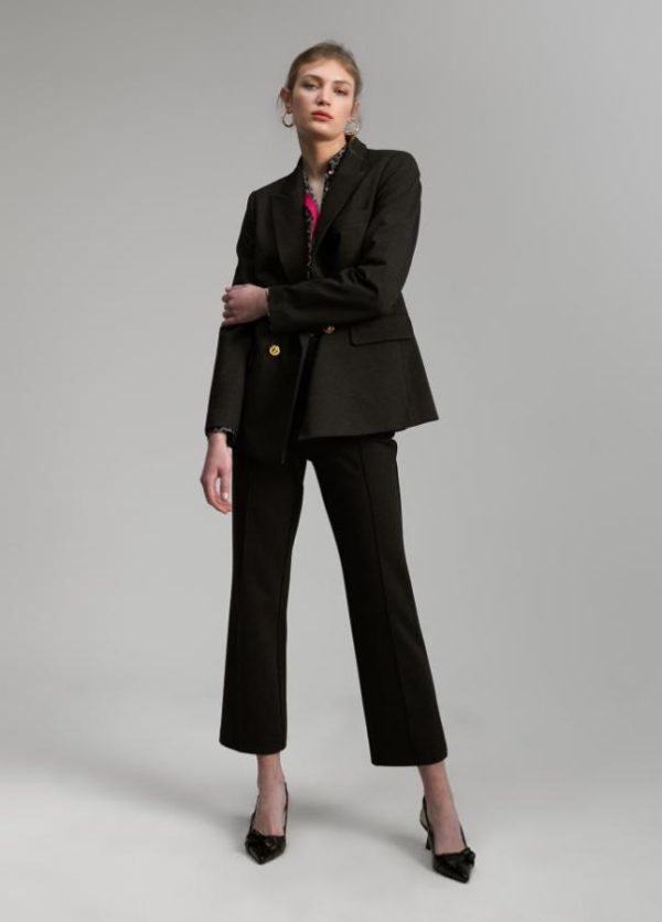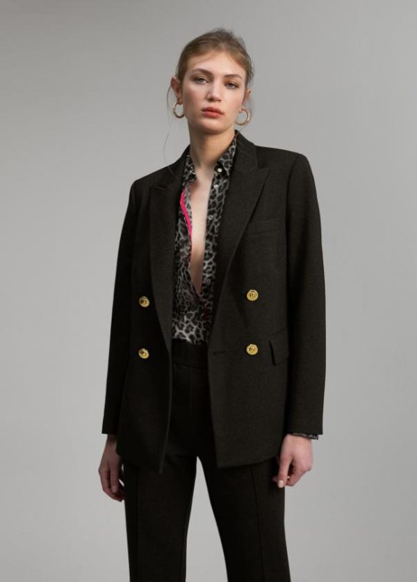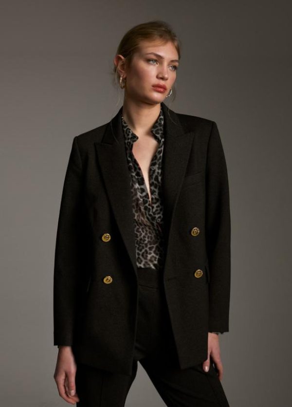 Blazer cruzada con detalle botón metálico animal. Cuello solapa. Tapetes con vivo de falso bolsillo lateral.