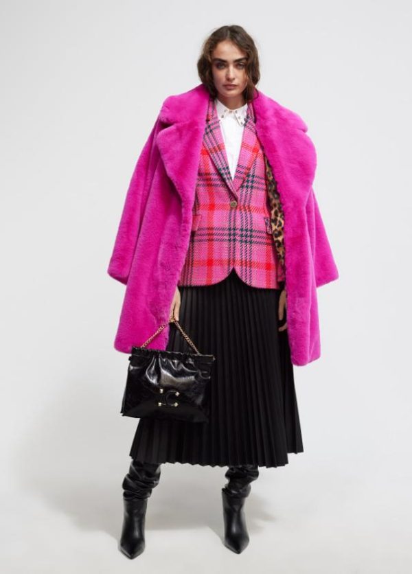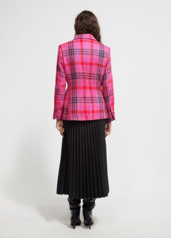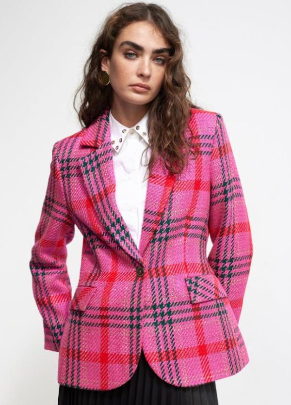 Blazer de cuadros en tweed. Cuello solapa y cerrada con un botón metálico. Bolsillos con tapete.