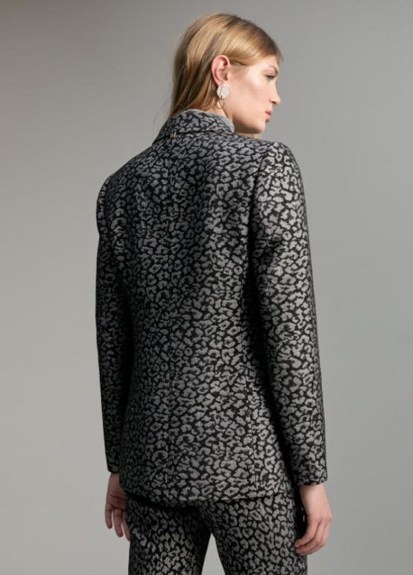 Blazer jacquard en estampado animal print bicolor. Cuello solapa y tapetes de bolsillos laterales.