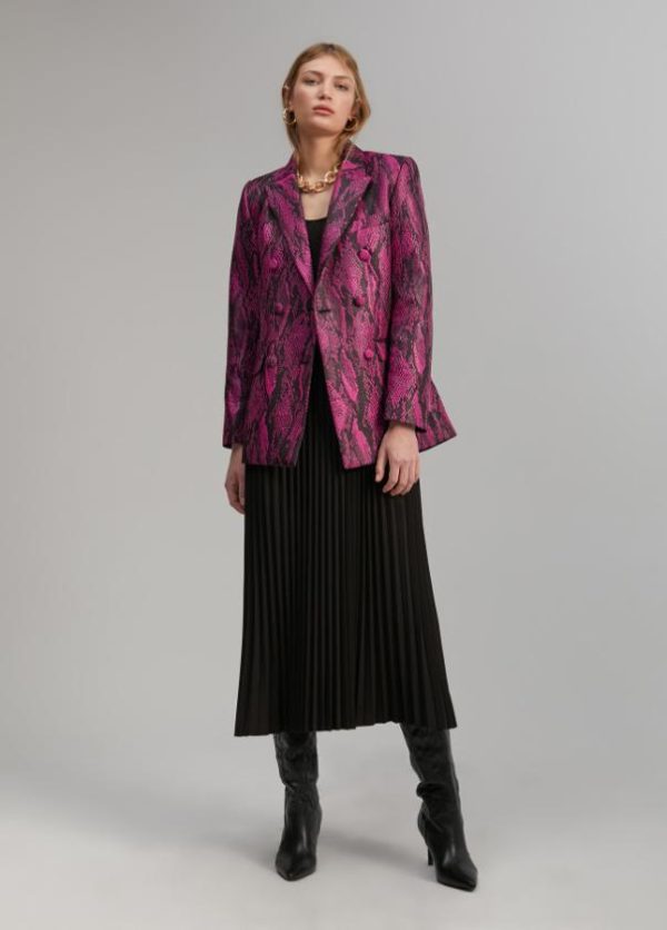 Blazer jacquard efecto serpiente bicolor. Cuello solapa y cruzada con botones forrados del mismo tejido. Tapetes con vivo en laterales.