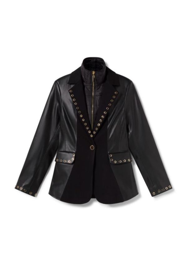 Blazer negro de cuello solapa. Tejido combinado en efecto piel y punto. Manga larga y falso chaleco en interior con cierre de cremallera. Cierre frontal con botón y detalles dorados en puños, tapete y solapa.