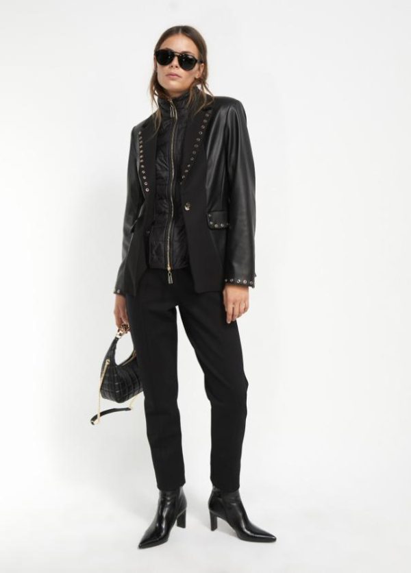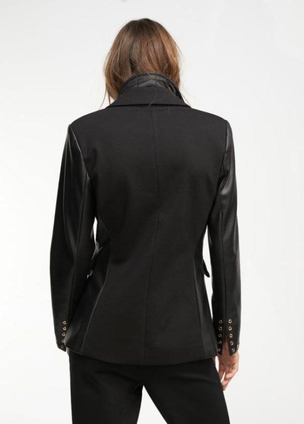 Blazer negro de cuello solapa. Tejido combinado en efecto piel y punto. Manga larga y falso chaleco en interior con cierre de cremallera. Cierre frontal con botón y detalles dorados en puños, tapete y solapa.