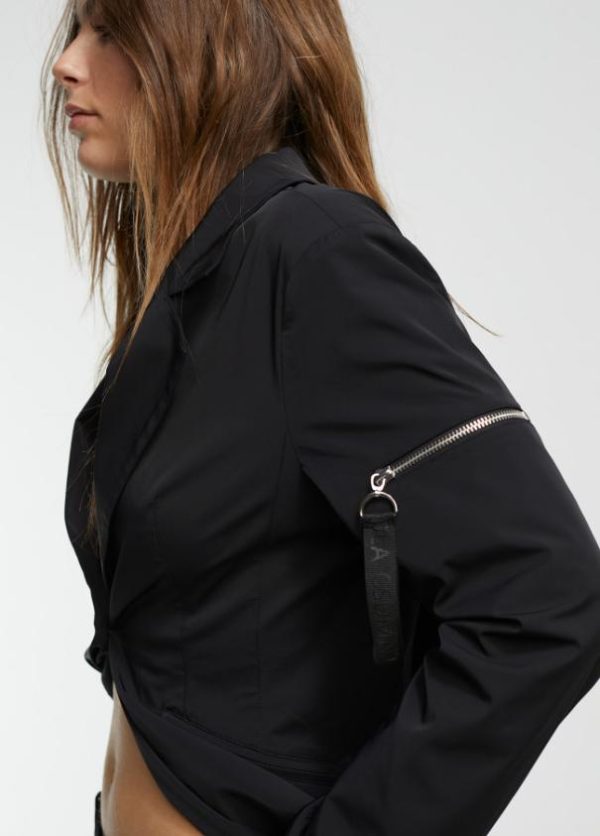 Blazer técnica. Cuello solapa y cerrada con botón. Detalle de bolsillos con cremallera metálica en frontal y bolsillo.