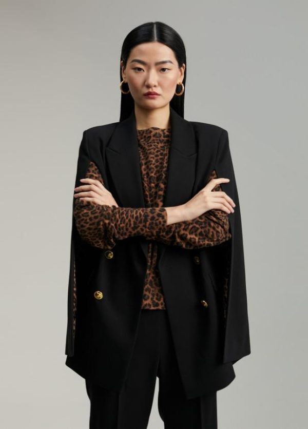 Blazer tipo capa con cuello solapa. Botones frontales en dorado. Tapete de bolsillos laterales. Forro contrastado en estampado animal print.