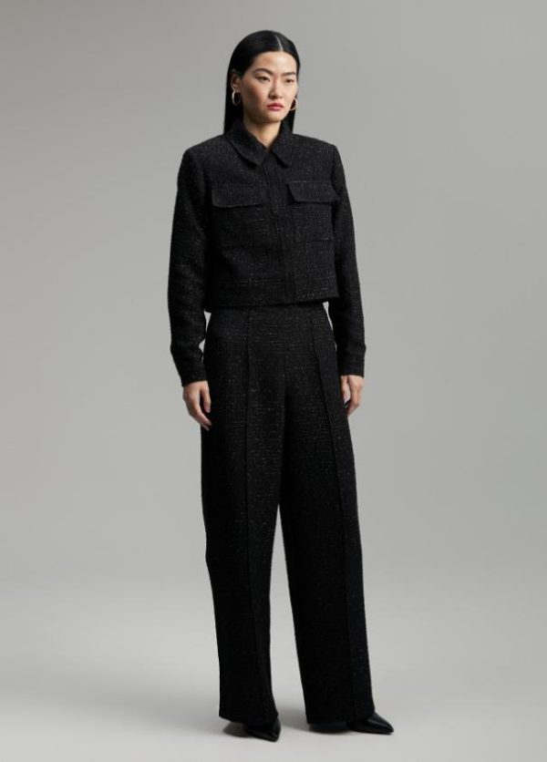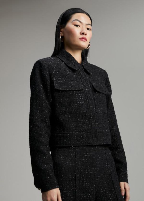 Chaqueta tweed cropped cerrada con snaps metálicos ocultos. Cuello y puños camiseros. Bolsillos frontales superiores tipo plastrón con tapete.