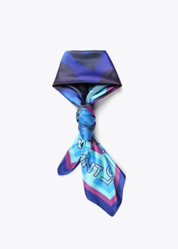 Pañuelo logotipado y combinado con estampado animal en tonos azules.