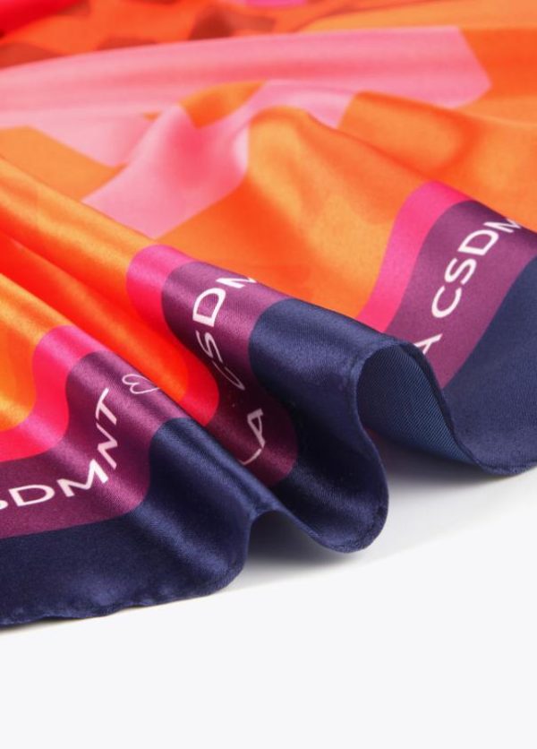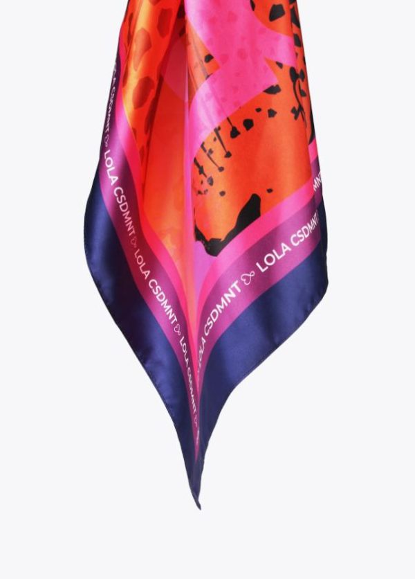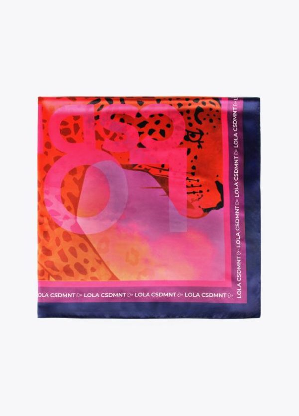 Pañuelo con mega logo central sobre fondo estampado leopardo en tonos violetas y naranjas.