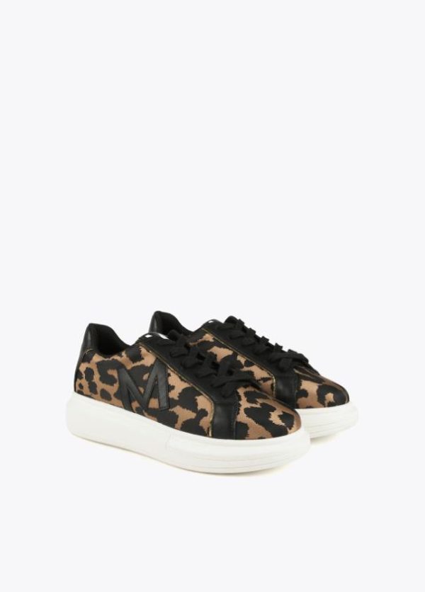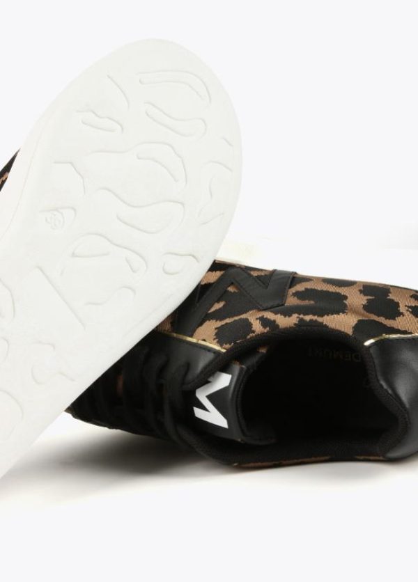 Zapatillas tipo sneakers con estampado animal combinado con detalles dorados y negros. Letra logo en efecto piel en laterales.