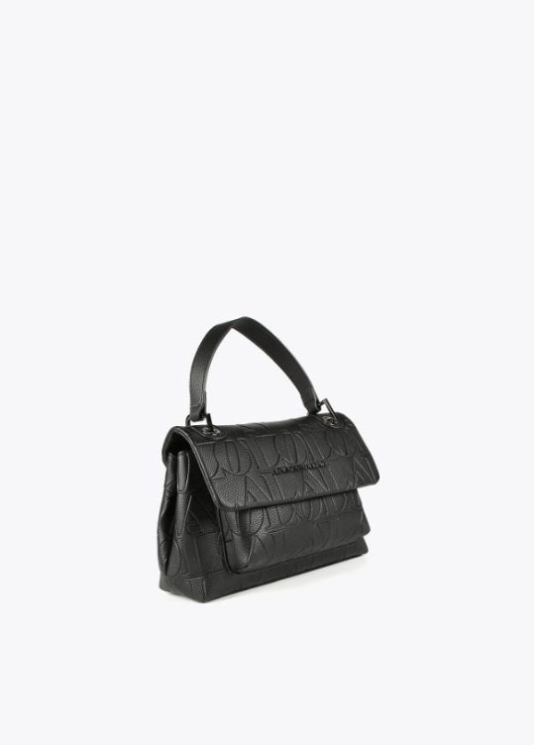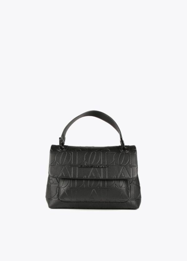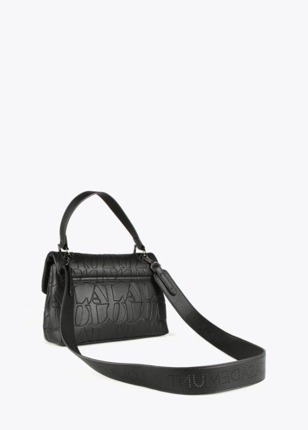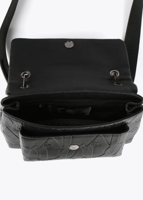Bolso tipo bandolera en efecto piel grabada y logo en parte frontal. Asa de mano y asa bandolera extraíble. Cierre con botón imantado y bolsillo interior.