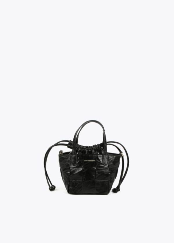 Bolsito trenzado en efecto piel con textura y saquito interior. Contiene asa bandolera y pequeño compartimento interior. Cierre con cordón ajustable.