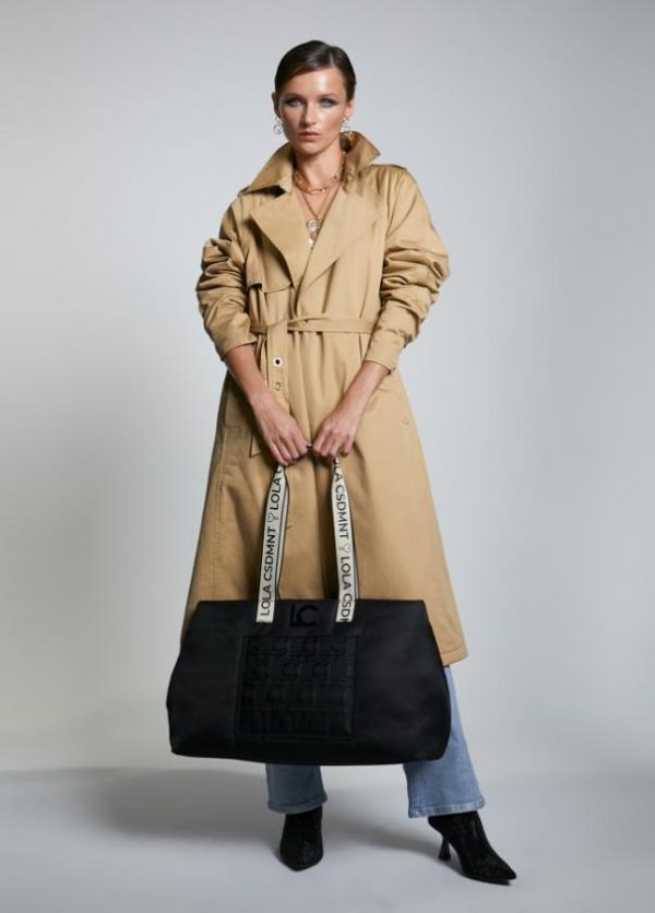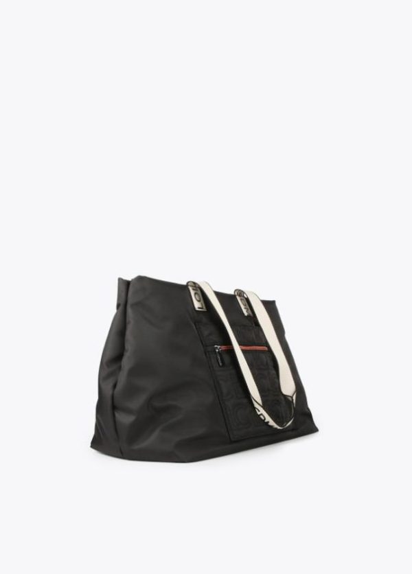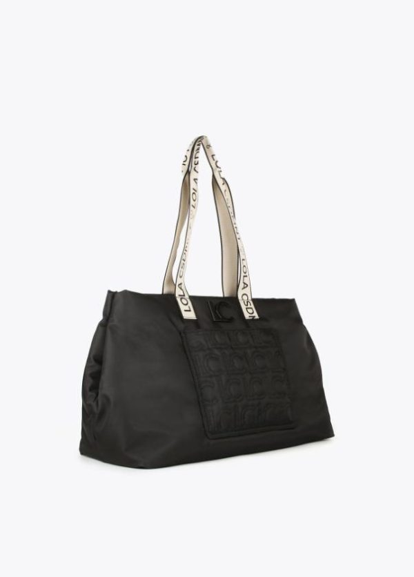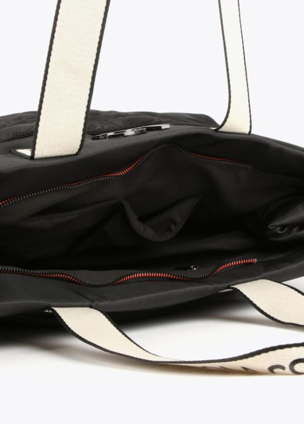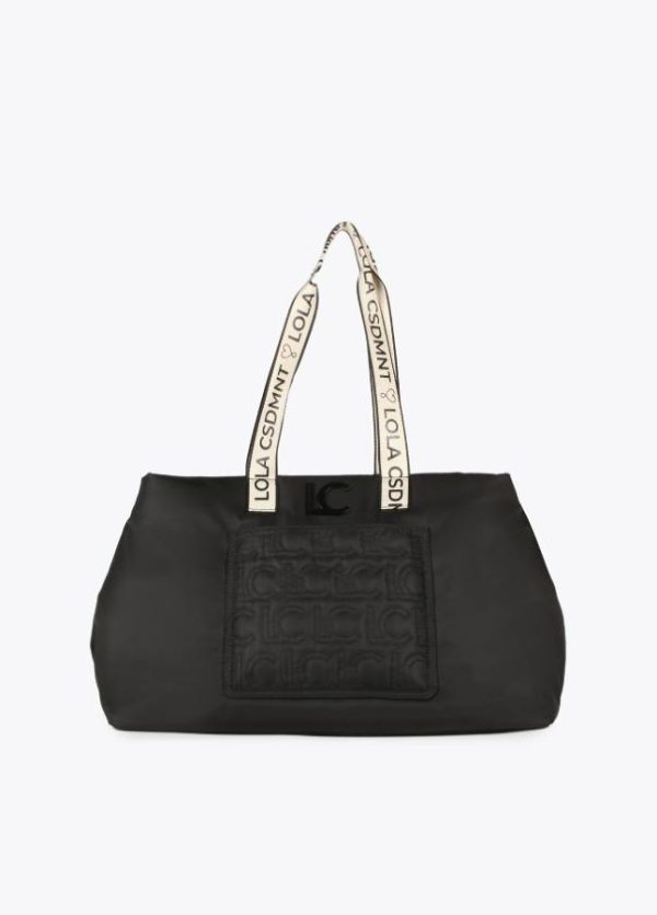 Weekend acolchado con monograma en relieve y asas logotipadas. Bolsillo trasero y cierre central con cremallera.