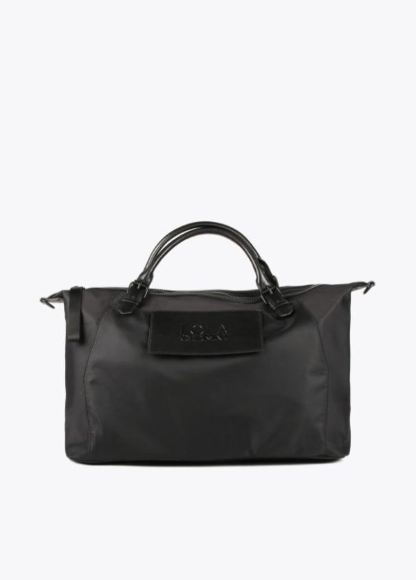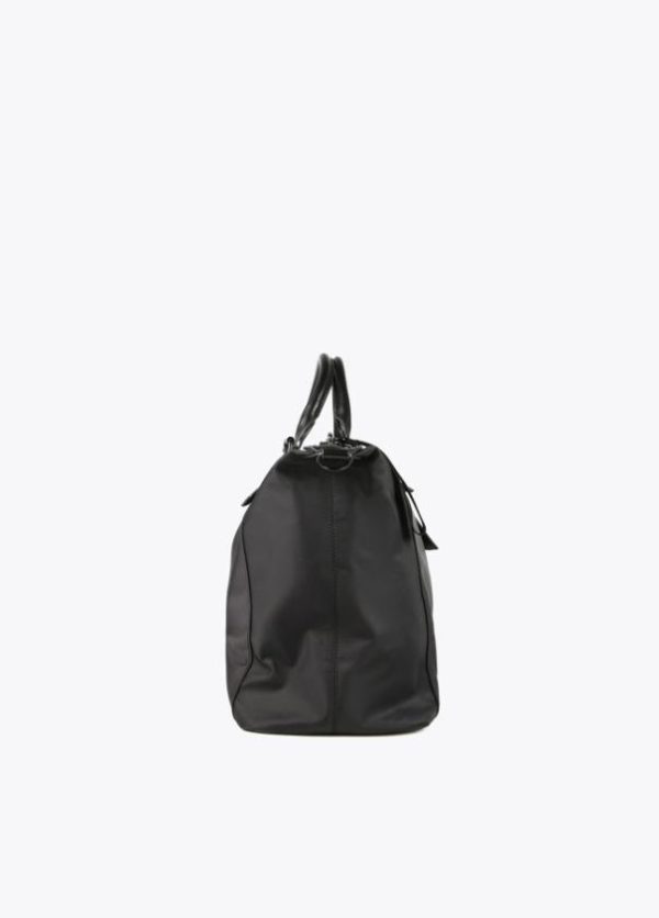 Weekend color negro de nylon y efecto piel combinados. Bolsillo y logo en parte frontal. Asas de mano y asa bandolera logotipada. Cierre de cremallera y compartimentos interiores.