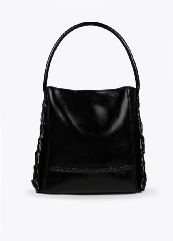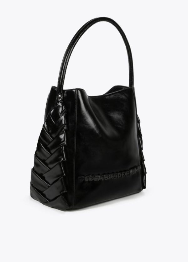 Bolso shopper en efecto piel. Detalles laterales trenzados y frontal con letras metálicas. Contiene pequeño bolsito interior. Cierre con imán.
