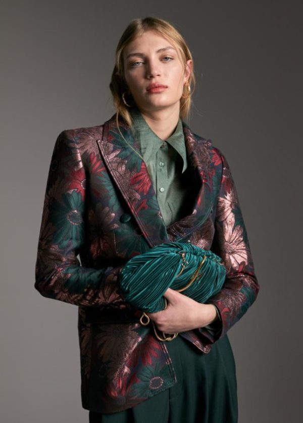 Bolso de fiesta con forma de concha plisado con cadena dorada extraíble. Detalle letra logo dorada en parte frontal.