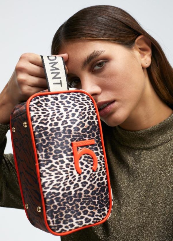 Neceser con estampados animal combinados y detalles color naranja. Logo lacado en parte frontal.