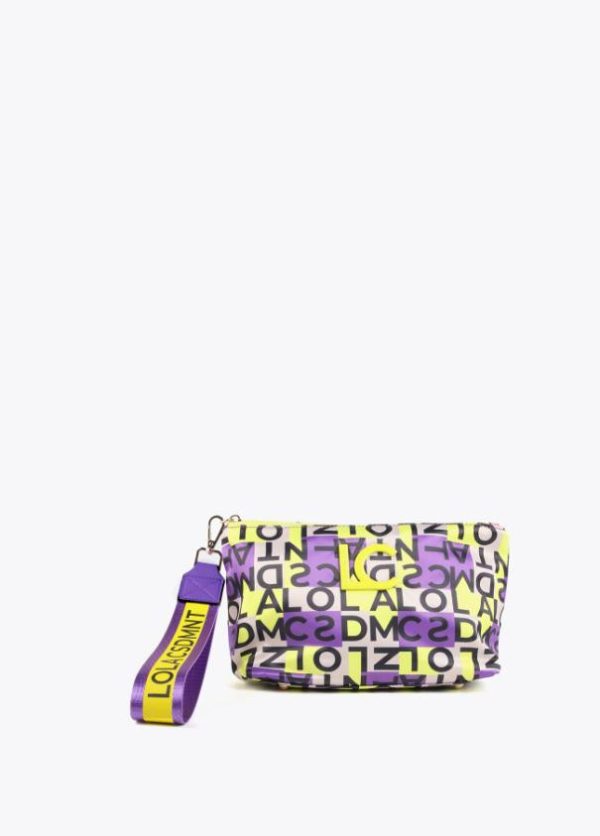 Neceser logotipado en tonos lila y amarillo. Logo lacado en parte frontal.