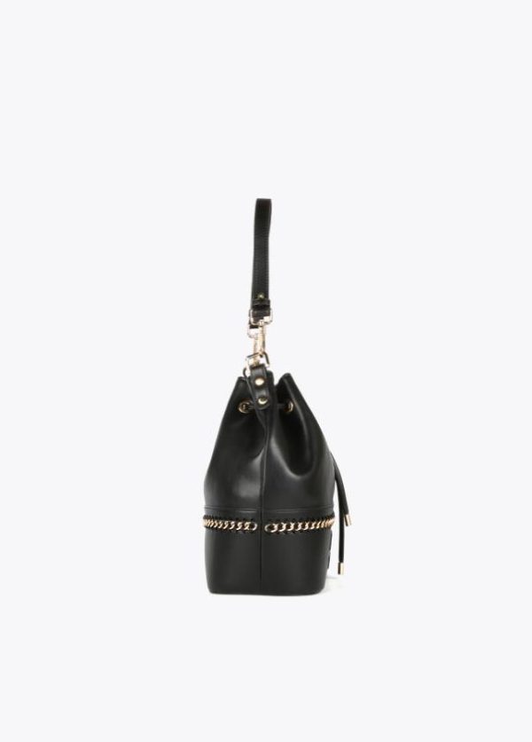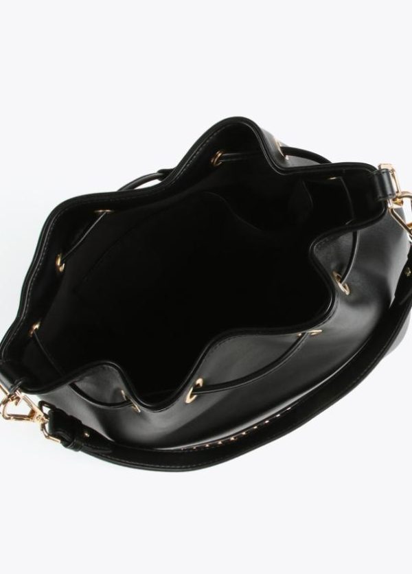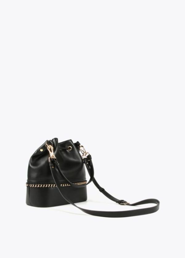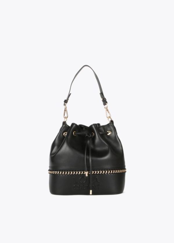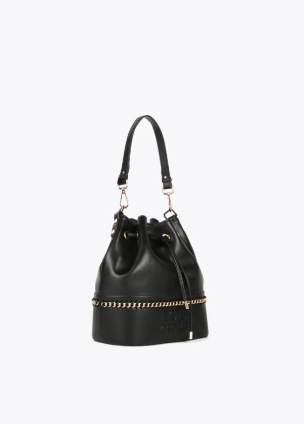 Bolso tipo bombonera en efecto piel y cadena y detalles dorados. Asa de hombro y asa bandolera. Cierre con cordón ajustable y logo en relieve en parte frontal.