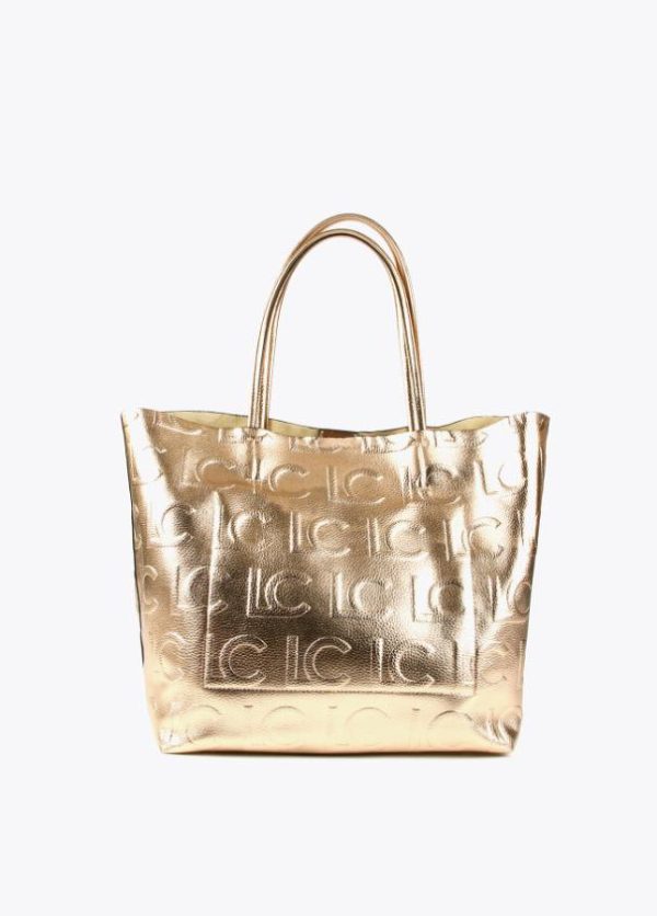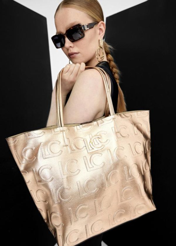 Bolso tipo shopper en efecto piel metalizado y con monograma grabado. Logo en zona frontal y cierre con botón imantado. Bolsito neceser interior logotipado con cremallera.