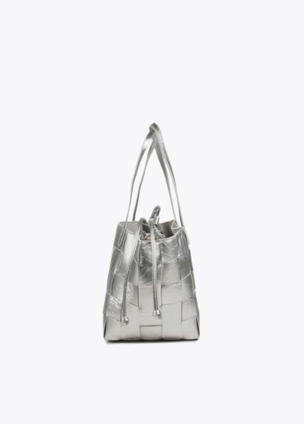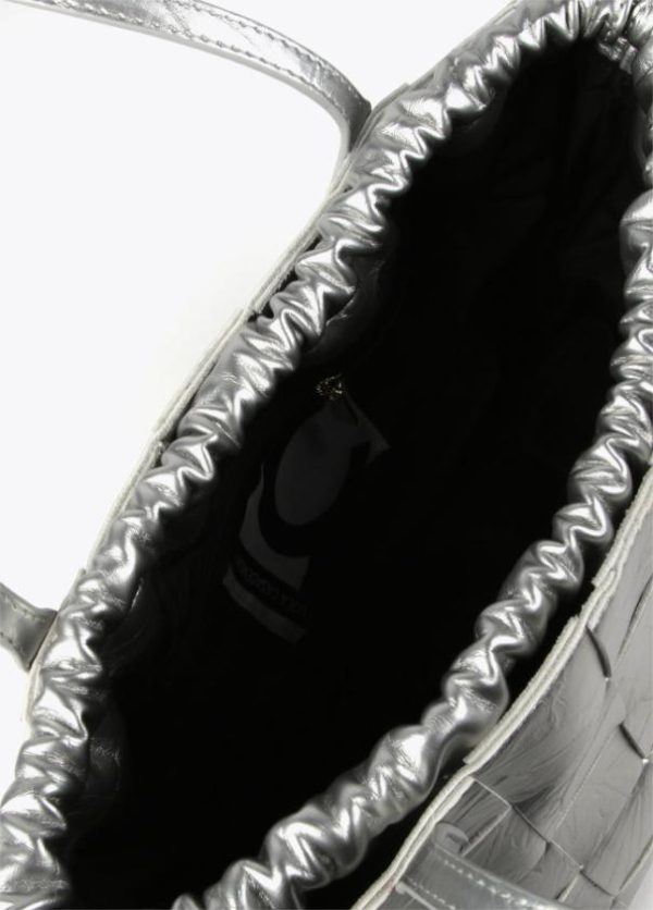 Bolso shopper trenzado en efecto piel con textura y saquito interior. Contiene asa bandolera y pequeño compartimento interior. Cierre con cordón ajustable.