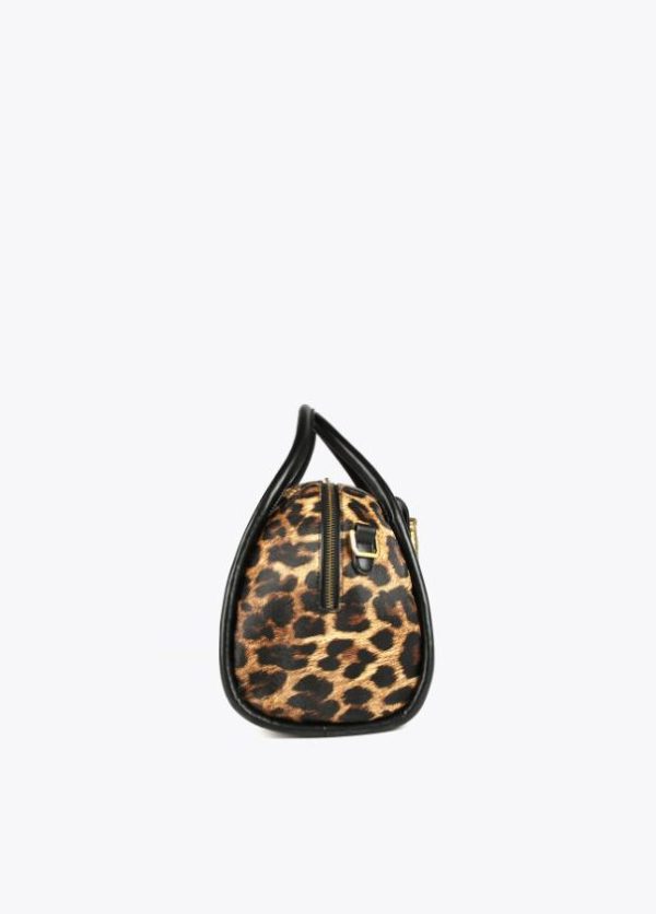 Bolso tipo bowling en efecto piel y estampado animal. Cierre de cremallera, bolsillo exterior con mega logo animal dorado en solapa y asas de mano y bandolera.