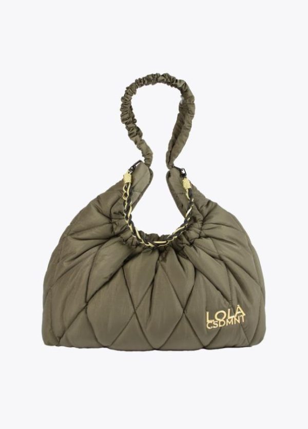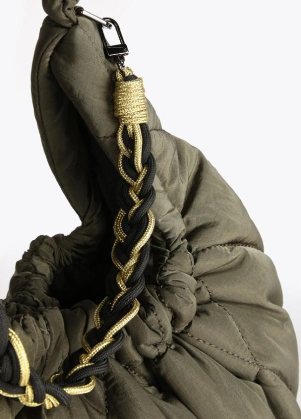 Bolso tipo shopper acolchado con asa trenzada de cordones extraíble. Cierre con botón imantado y logo dorado en parte frontal.