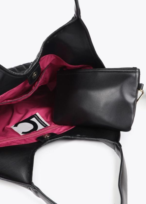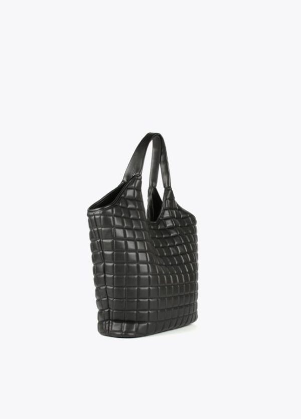 Bolso tipo shopper acolchado de cuadros con mega logo dorado en parte frontal. Cierre con botón imantado en lengüeta y detalle bolsito interior.