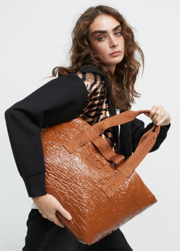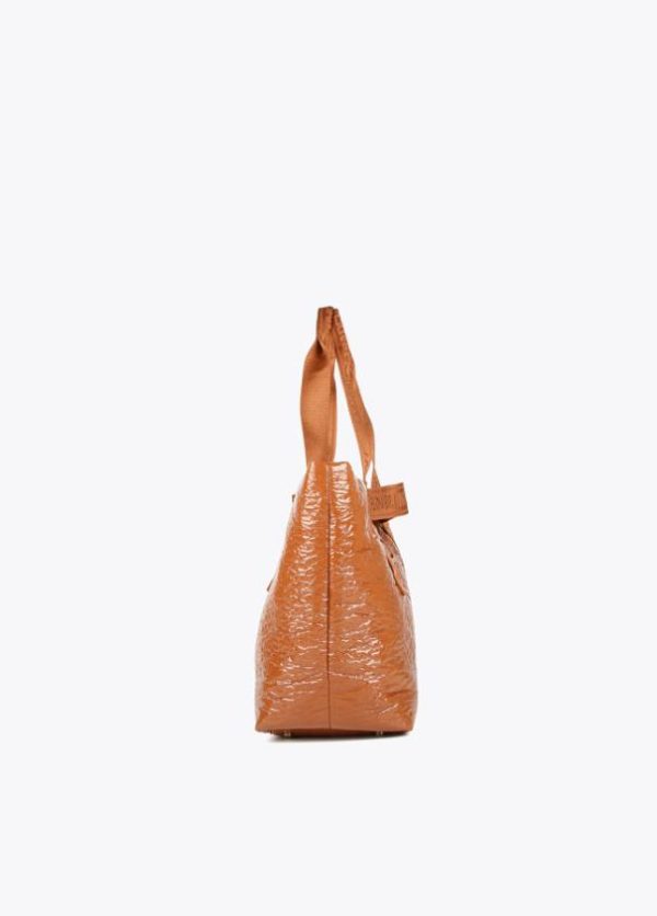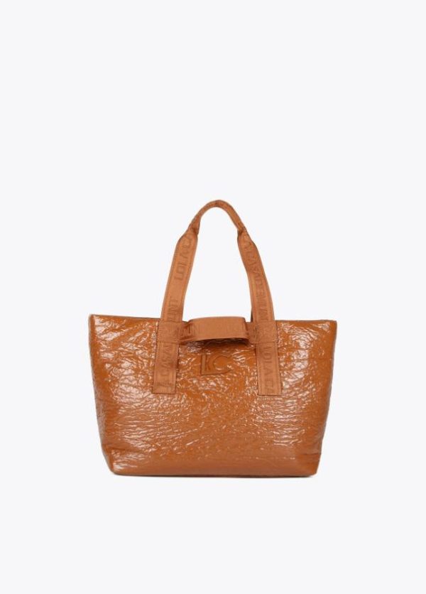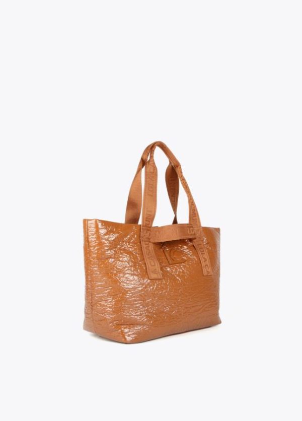 Bolso tipo shopper efecto charol arrugado con asas al tono logotipadas. Cierre con lengüeta y botón clic y detalle bolsito neceser interior.