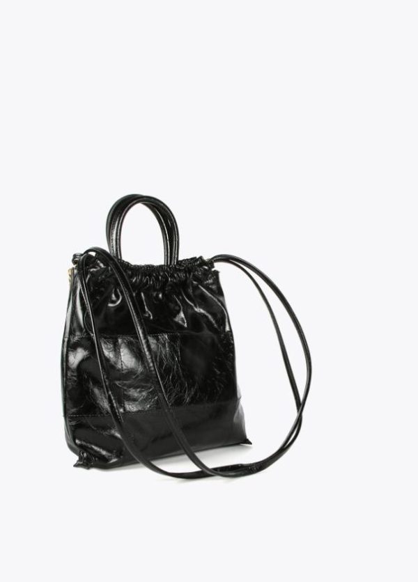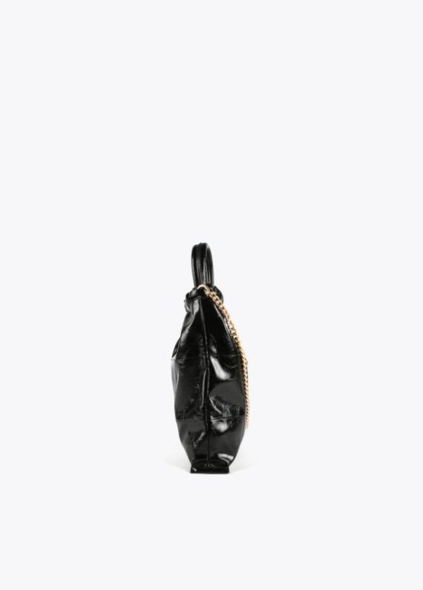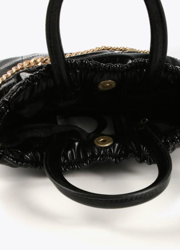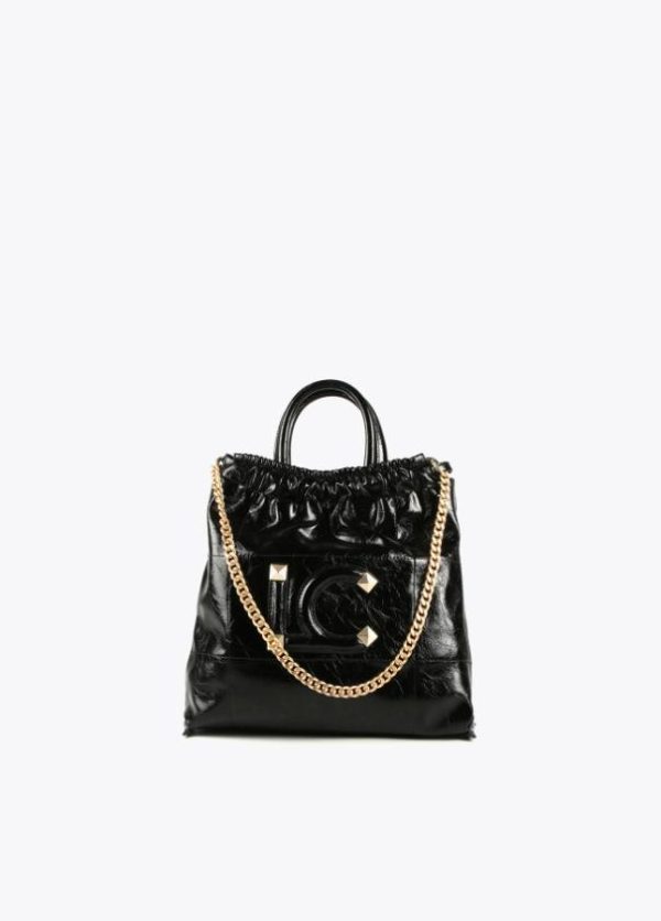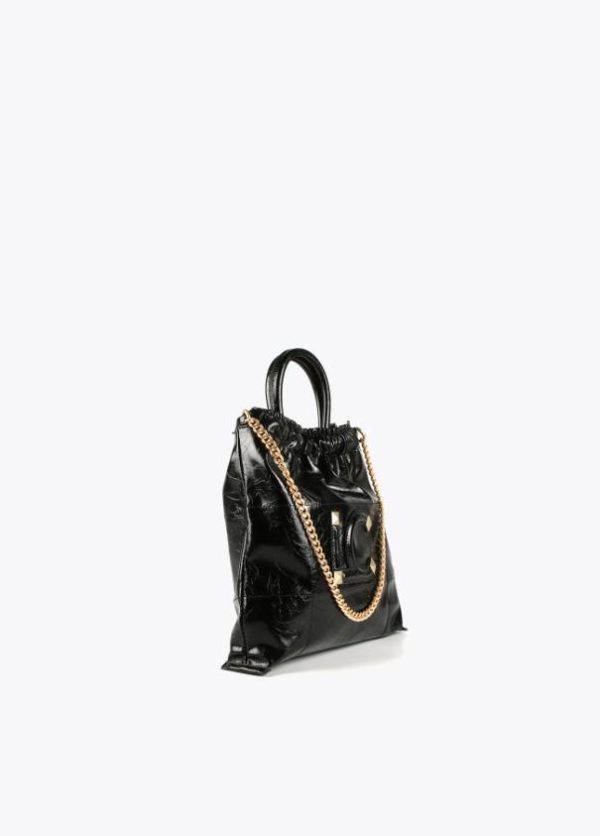 Bolso tipo shopper en efecto piel brillante y mega logo en parte frontal con detalles dorados. Asas de mano y asa bandolera de cadena dorada extraíble.