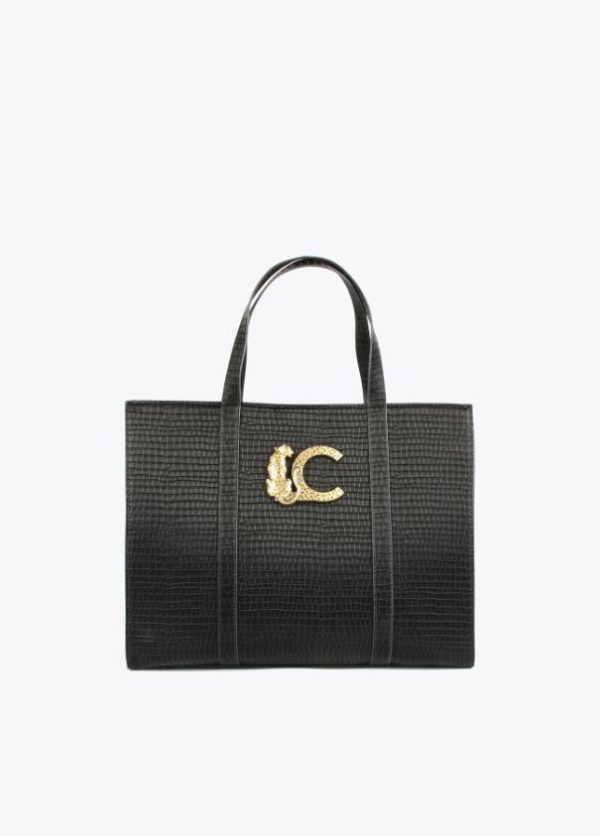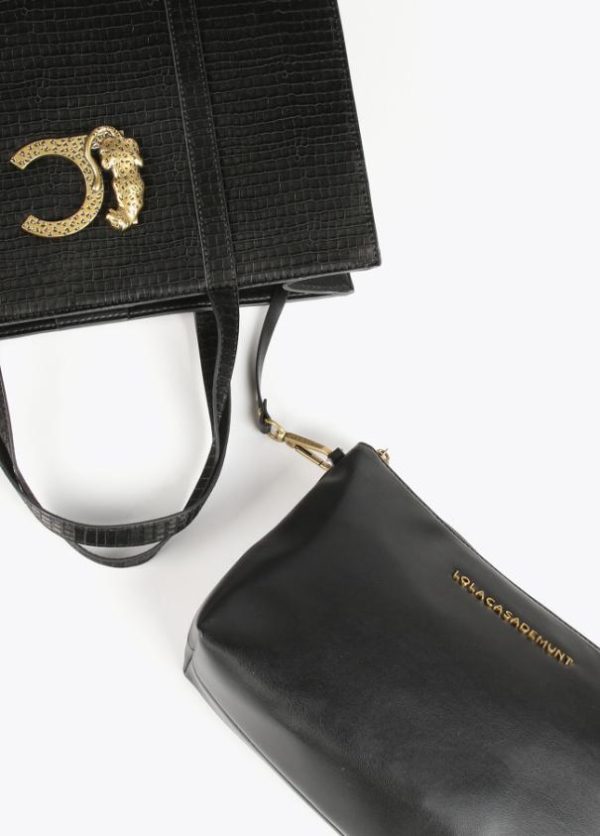 Bolso tipo shopper en efecto piel cocodrilo. Mega logo animal dorado en parte frontal. Asas de hombro y asa bandolera. Bolsito neceser interior logotipado.