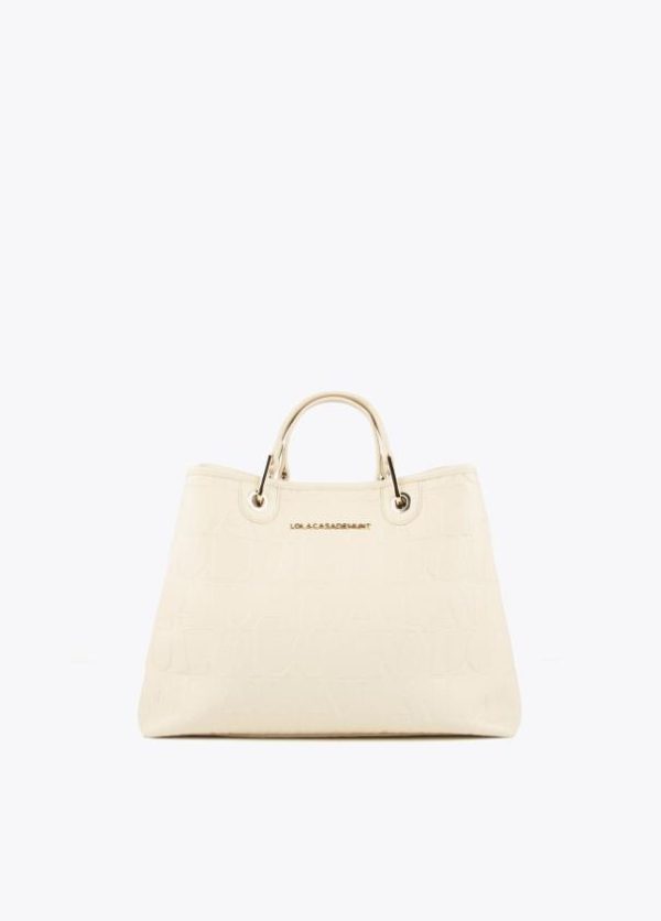 Bolso tipo shopper grabado en efecto piel y logo en parte frontal. Asas de mano y asa bandolera ajustable y extraíble. Cierre con botón imantado en lengüeta.