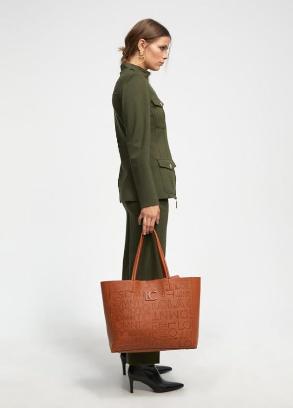 Bolso tipo shopper en efecto piel troquelado y logo lacado en parte frontal. Asas de hombro, cierre con botón imantado en lengüeta y bolsito neceser interior con cierre de cremallera.