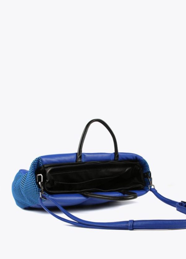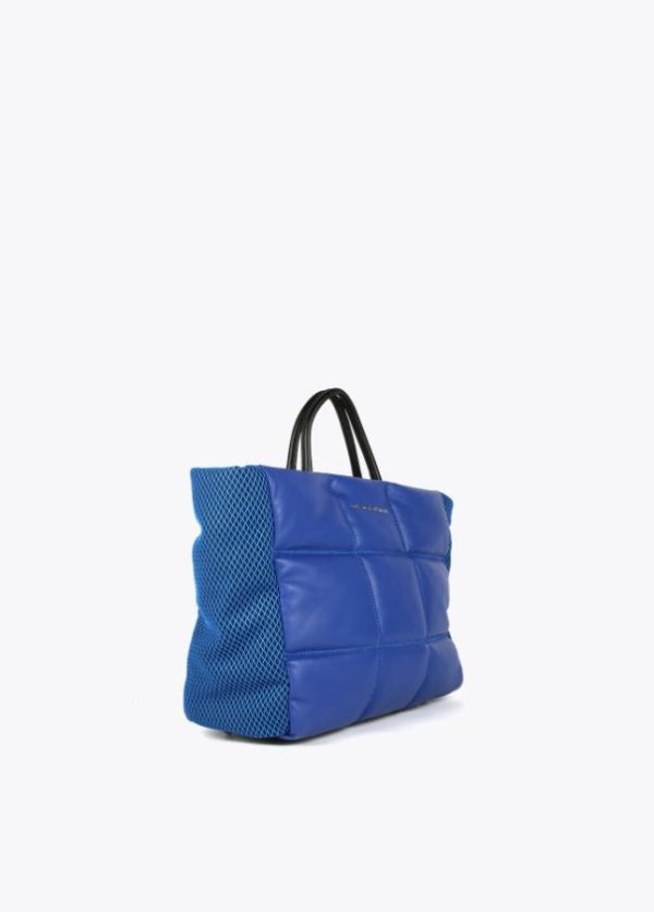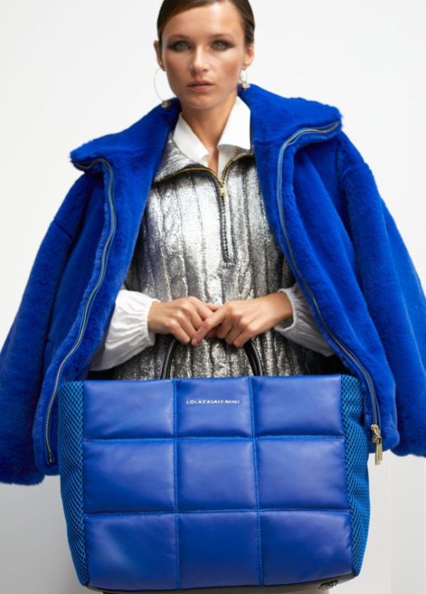 Bolso tipo shopper acolchado en efecto piel en color azul y negro combinados. Asas de mano y asa bandolera ajustable y extraíble. Cierre de cremallera.
