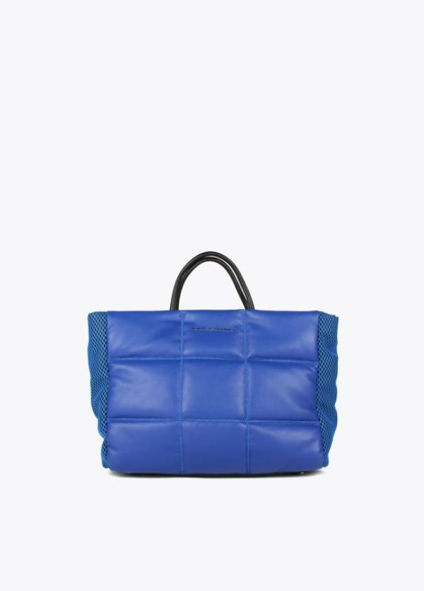 Bolso tipo shopper acolchado en efecto piel en color azul y negro combinados. Asas de mano y asa bandolera ajustable y extraíble. Cierre de cremallera.