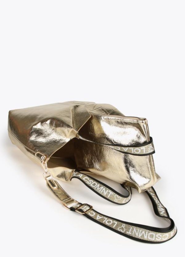 Bolso tipo shopper metalizado con detalle logo en relieve. Asas de hombro y asa bandolera logotipadas. Bolsillo exterior con cremallera y bolsito neceser interior logotipado.