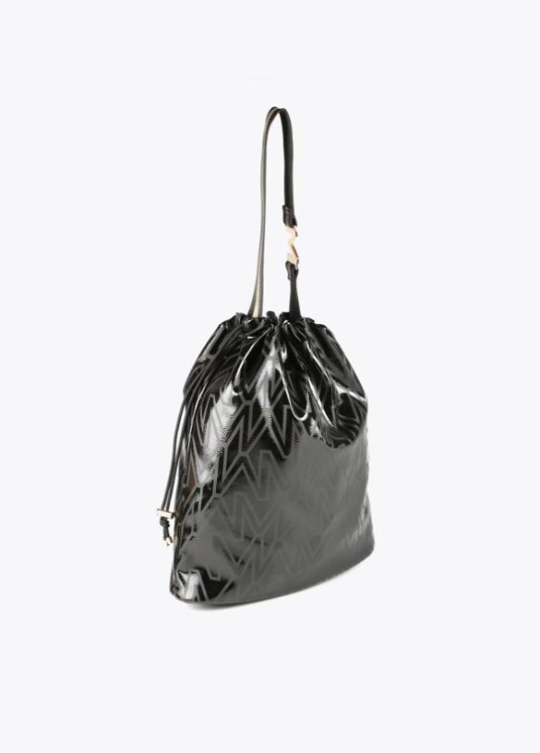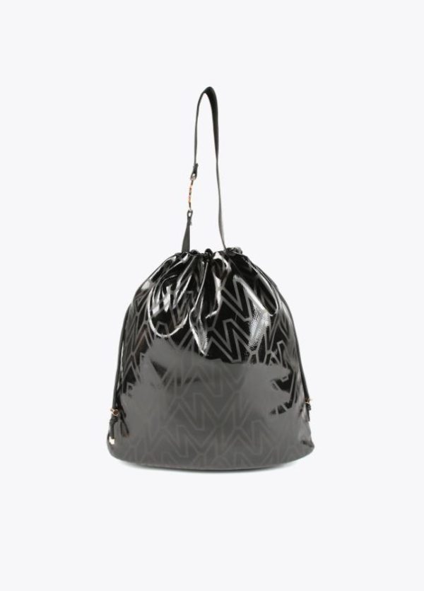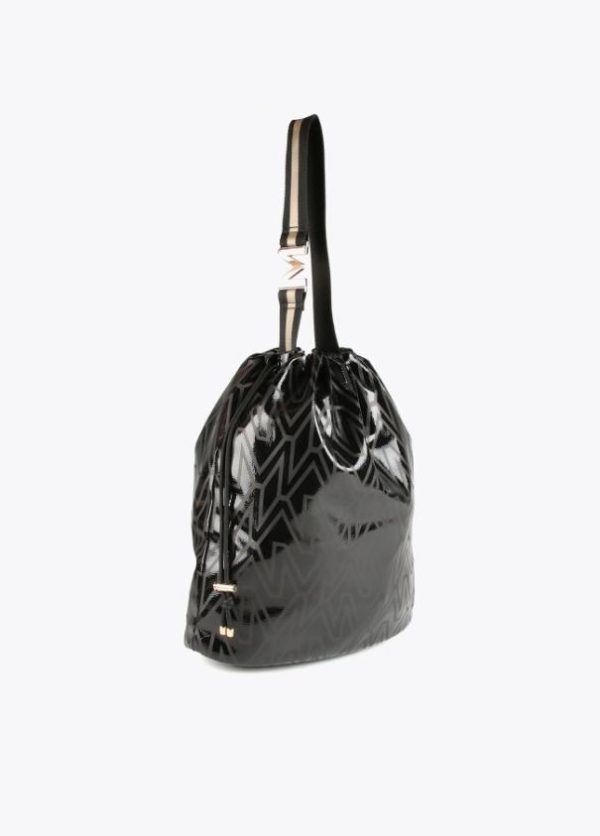 Bolso shopper tipo saco con estampado monograma. Asa con letra logo dorada y cierre con cordón ajustable.