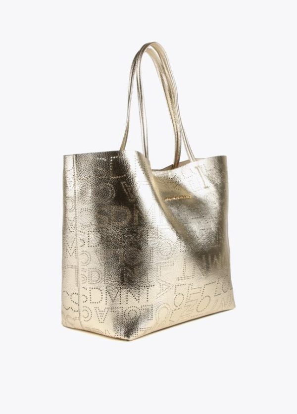 Bolso tipo shopper metalizado y con logo troquelado. Asa de hombro y cierre con lengüeta. Detalle bolsito neceser interior con cierre de cremallera.