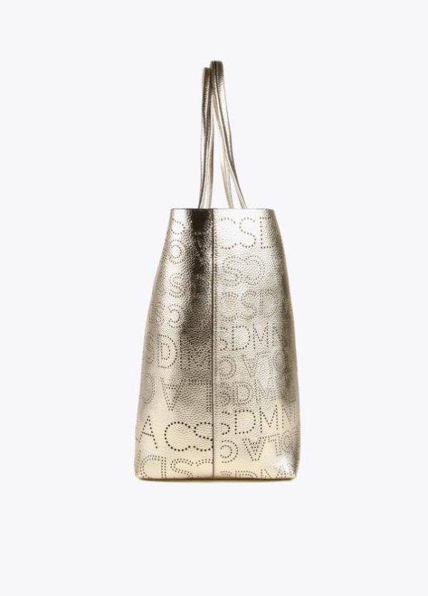 Bolso tipo shopper metalizado y con logo troquelado. Asa de hombro y cierre con lengüeta. Detalle bolsito neceser interior con cierre de cremallera.