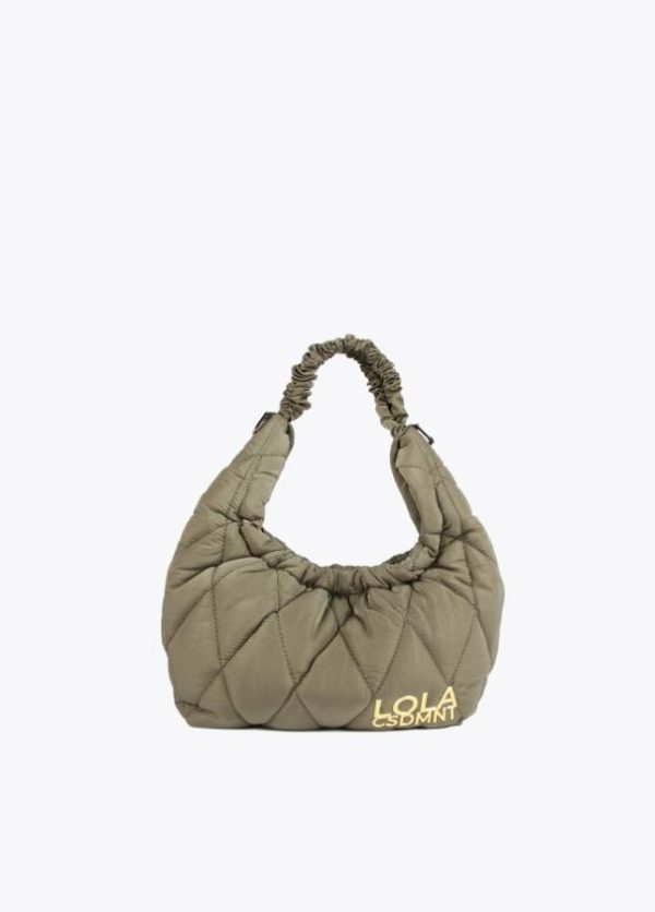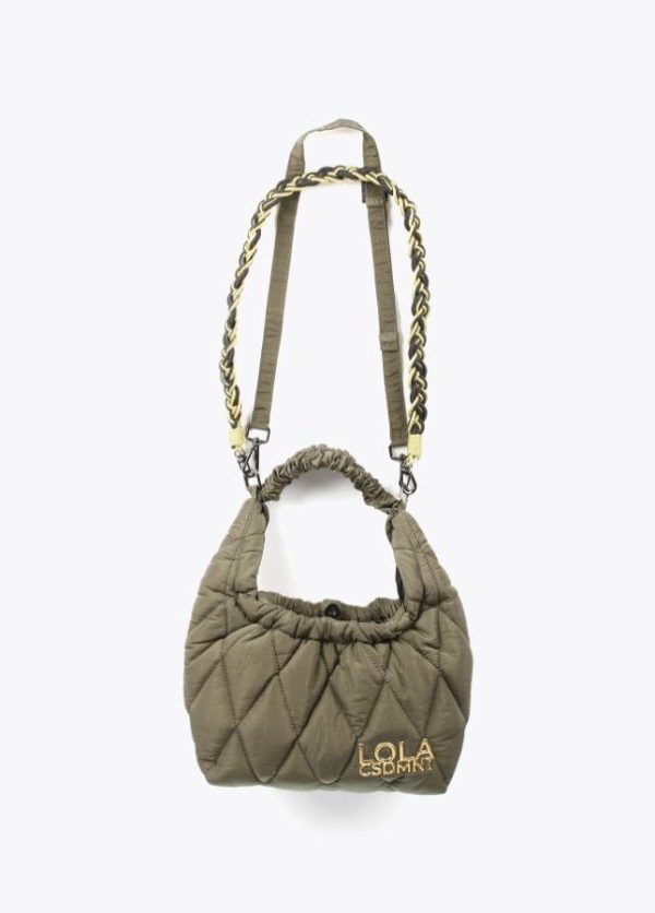 Bolso tipo bandolera acolchada con mega logo en parte frontal inferior. Asa de hombro y asa bandolera de cordones trenzados extraíble.