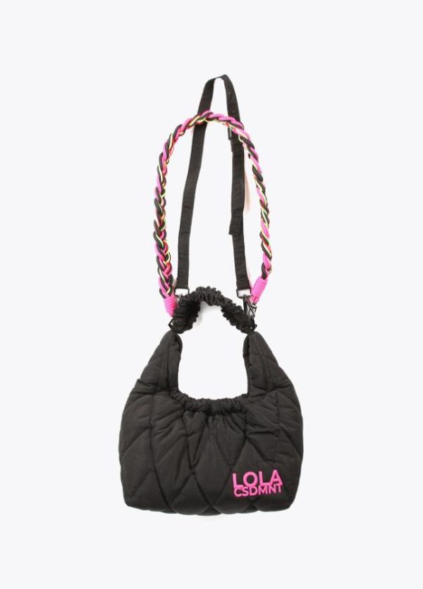 Bolso tipo bandolera acolchada con mega logo en parte frontal inferior. Asa de hombro y asa bandolera de cordones trenzados extraíble.