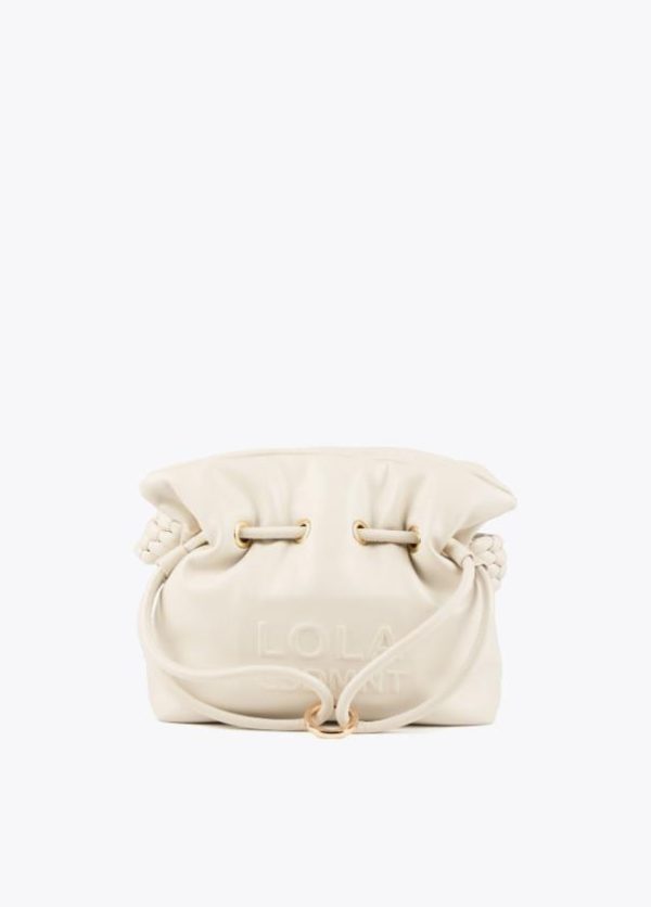 Bolso tipo bandolera en efecto piel con logo en relieve en parte frontal. Asa bandolera trenzada, cordón ajustable y cierre con botón imantado.