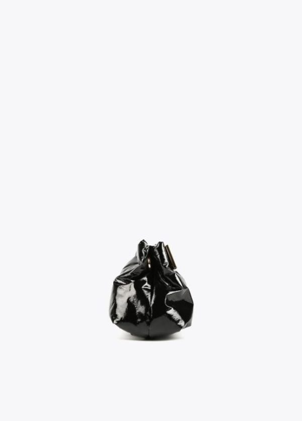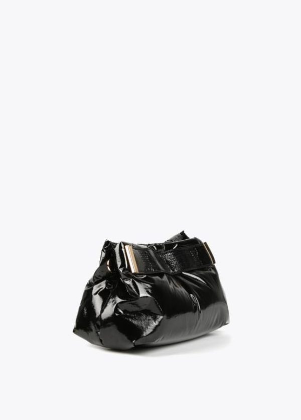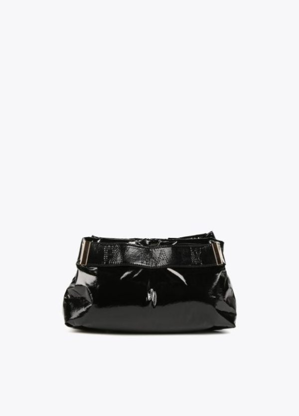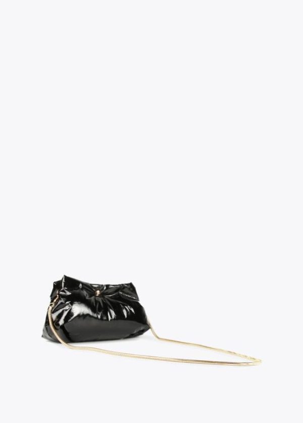 Bolso tipo bandolera efecto charol brillante con asa bandolera de cadena extraíble y cinta logotipada en parte frontal. Cierre con botón imantado y bolsillo interior.