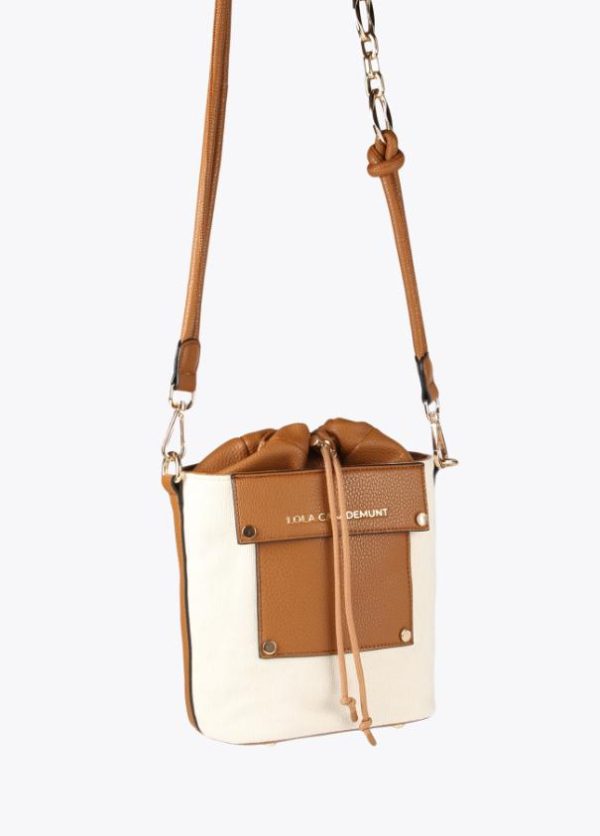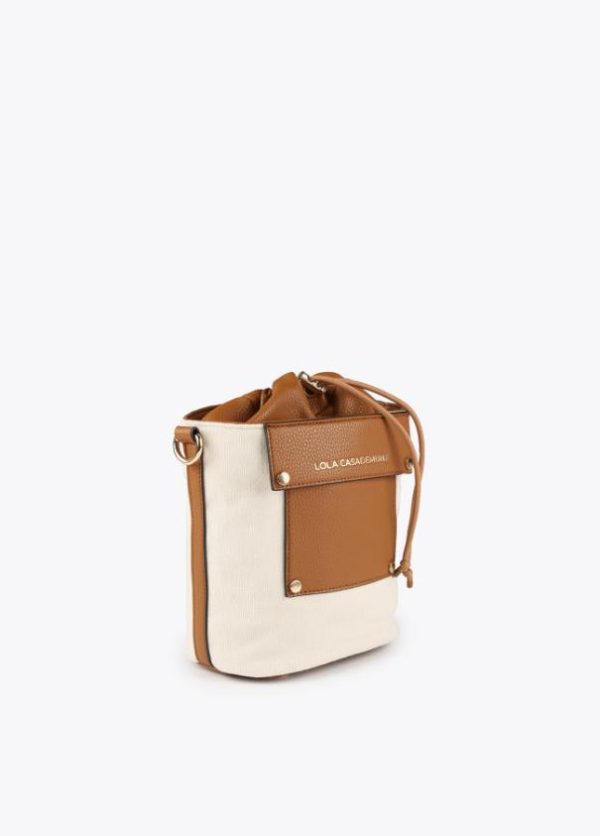 Bandolera tipo bombonera en loneta y efecto piel. Bolsillo y logo en parte frontal. Asa bandolera ajustable y extraíble. Cierre de cordón en saco interior.