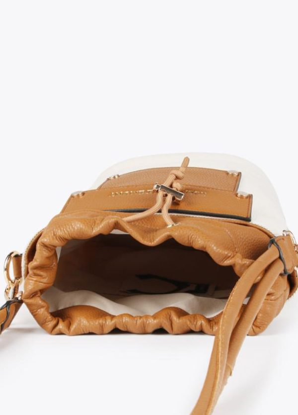 Bandolera tipo bombonera en loneta y efecto piel. Bolsillo y logo en parte frontal. Asa bandolera ajustable y extraíble. Cierre de cordón en saco interior.