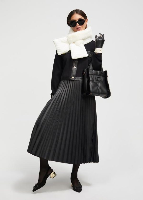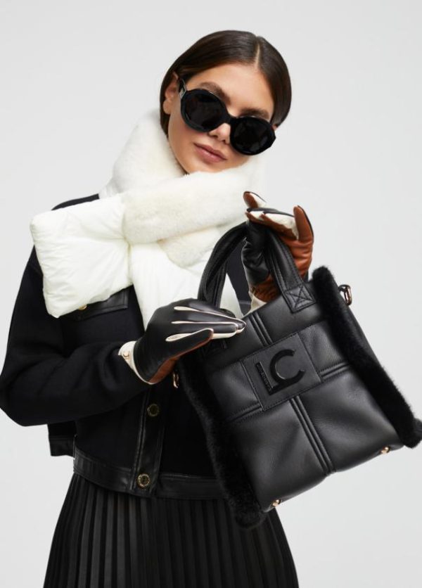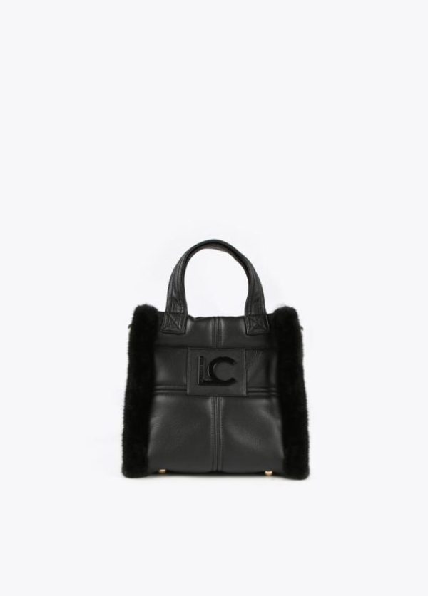 Bolso tipo bandolera en efecto piel y efecto pelo combinados. Asas de mano y asa bandolera ajustable y extraíble. Cierre con botón imantado y logo lacado en parte frontal.