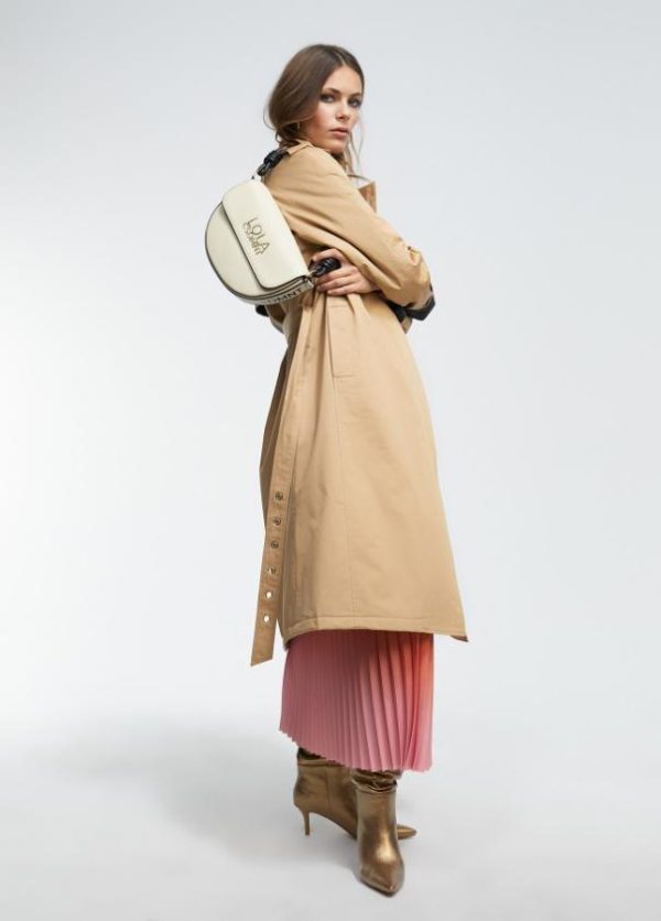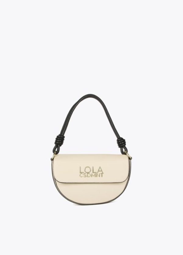 Bolso tipo bandolera en efecto piel con forma de medialuna. Asa de hombro y asa bandolera logotipada. Cierre con botón imantado en solapa.