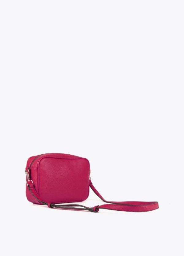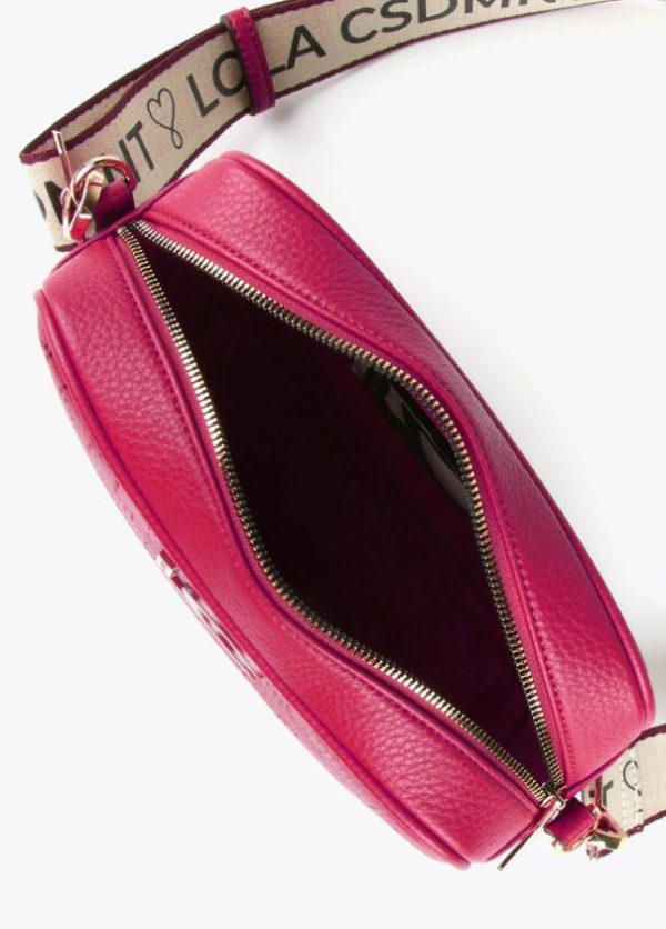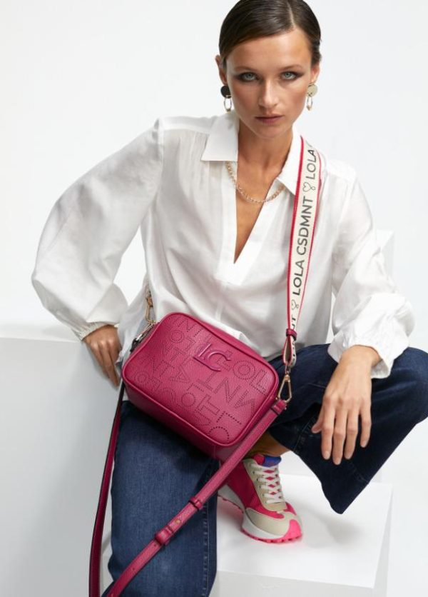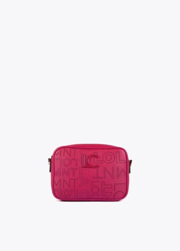 Bolso tipo bandolera con logotipo troquelado y logo lacado al tono en zona frontal. Cierre de cremallera y asa bandolera ajustable y extraíble.