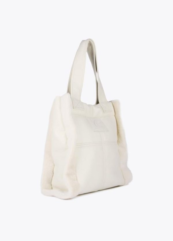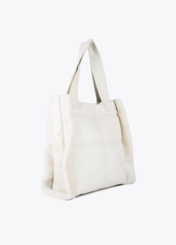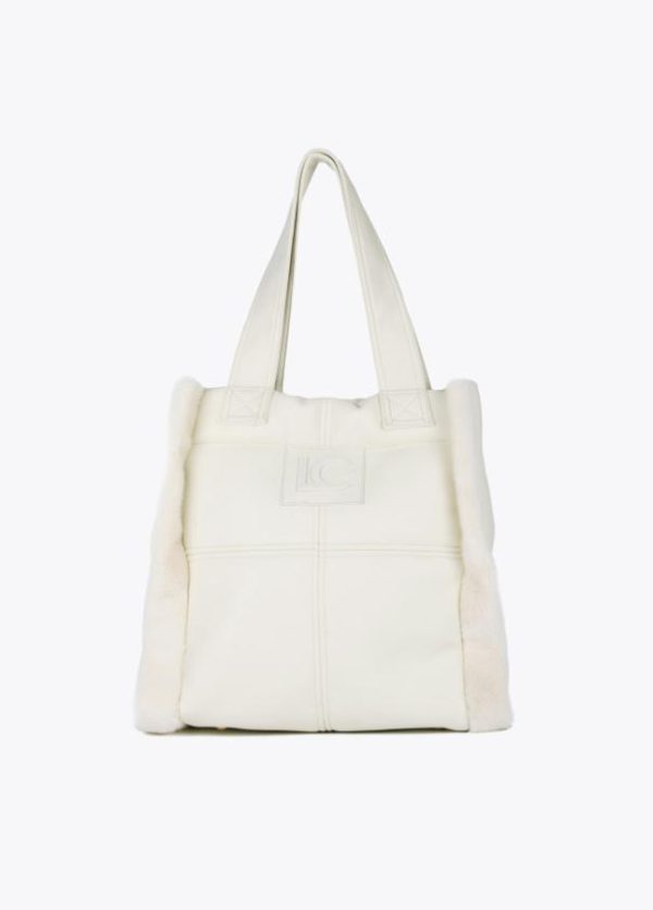 Bolso tipo shopper en efecto piel y efecto pelo combinados. Logo lacado en parte frontal, asa de hombro y cierre con botón imantado.